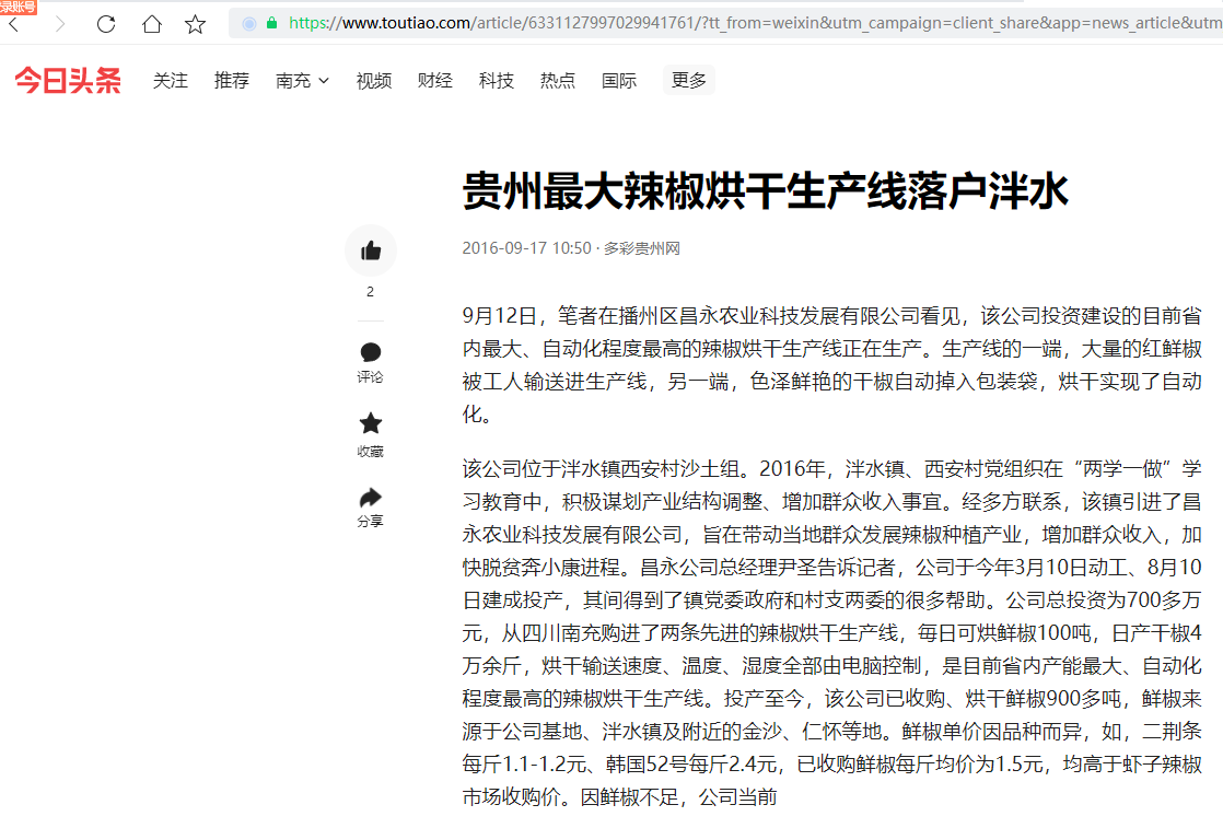 今日頭條引用遵義日報的內容,報道了昌永農業(yè)科技發(fā)展有限公司 引進(jìn)我公司大型辣椒烘干生產(chǎn)線(xiàn)的新聞,我公司致力于辣椒烘干多年...